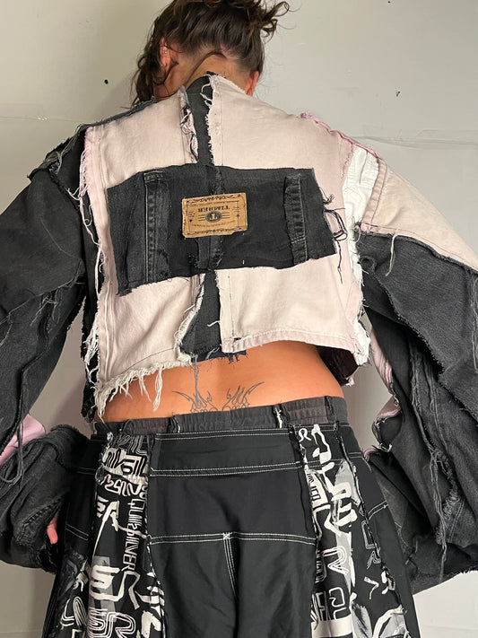 BLACK/PINK DENIM DISTRESSED BIKER SPG JACKET
